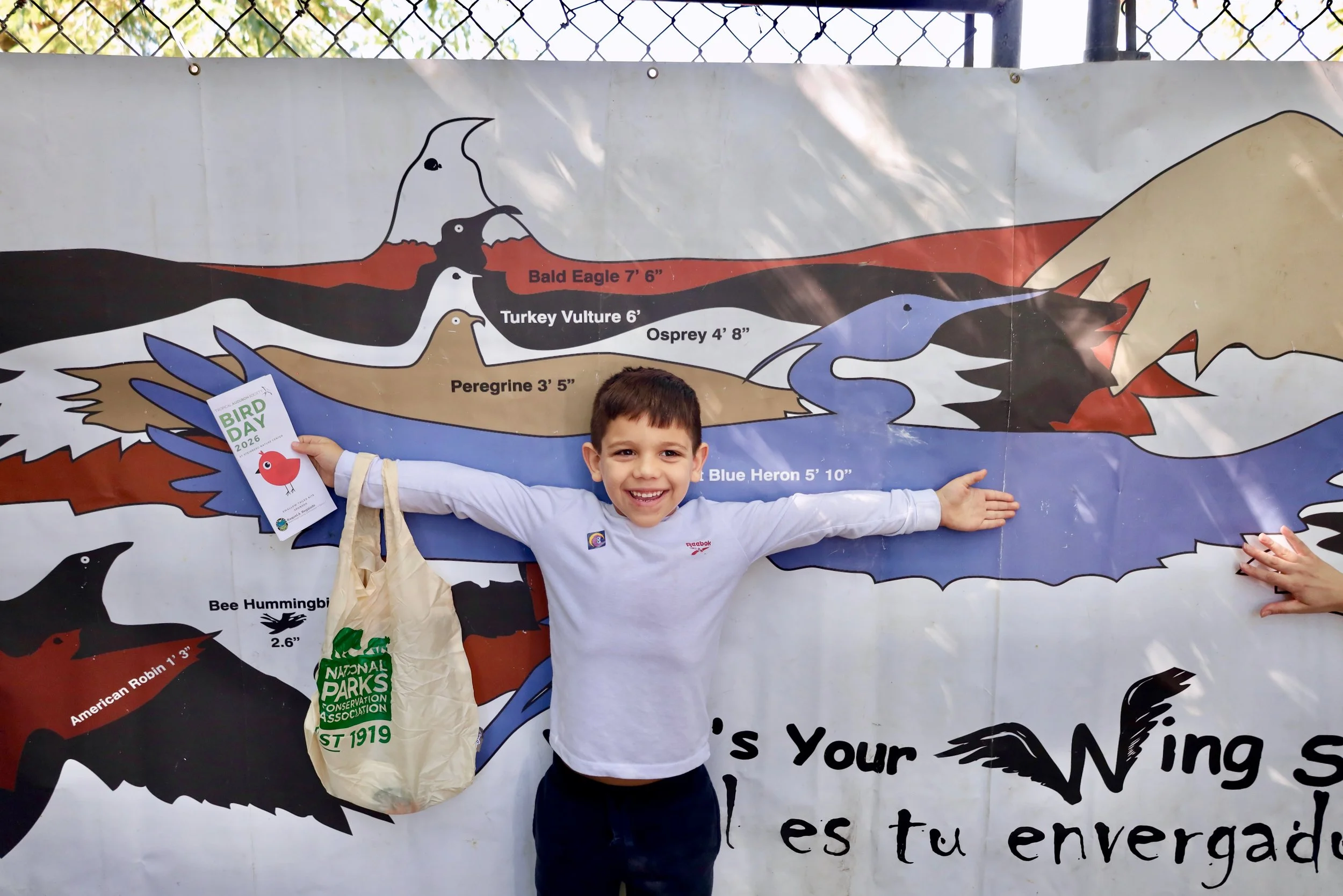 A BIRD DAY visitor measures his “wingspan” on our educational banner